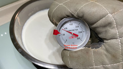 1.)全脂鮮奶倒入鍋中,以小火煮至80˚c (不要煮沸騰!),立刻離火